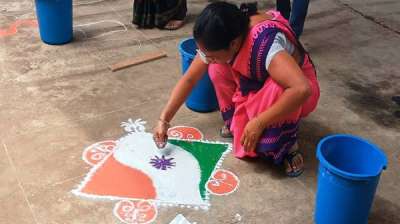 बहनों ने रंगोली बनाकर दिया "हर घर तिरंगा" अभियान का संदेश