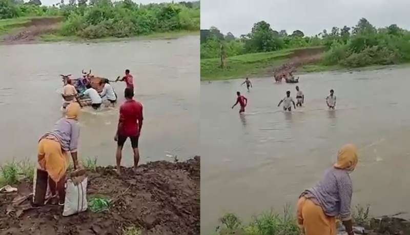 उफनती नदी में बैलगाड़ी बनी एकमात्र सहारा
