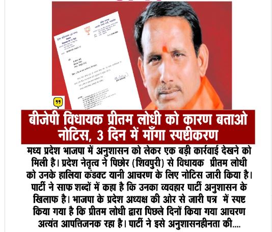 भोपाल/शिवपुरी, 22 अप्रैल 2026। मध्यप्रदेश की सियासत में अनुशासन को लेकर भारतीय जनता पार्टी ने सख्त रुख अपनाते हुए पिछोर विधायक प्रीतम लोधी को कारण बताओ नोटिस जारी किया है। पार्टी ने उनके हालिया आचरण को “अत्यंत आपत्तिजनक” और संगठन के अनुशासन के विपरीत बताते हुए 3 दिन के भीतर जवाब मांगा है। यह नोटिस हेमंत खंडेलवाल द्वारा जारी किया गया है, जो भाजपा प्रदेश संगठन में महत्वपूर्ण भूमिका निभा रहे हैं। जारी पत्र में स्पष्ट कहा गया है कि यदि निर्धारित समय में संतोषजनक स्पष्टीकरण प्रस्तुत नहीं किया गया, तो विधायक के खिलाफ संगठनात्मक कार्रवाई की जाएगी। पत्र में यह भी उल्लेख किया गया है कि संबंधित आचरण पार्टी की मर्यादा और अनुशासन के अनुरूप नहीं है, जिससे संगठन की छवि प्रभावित हो सकती है।