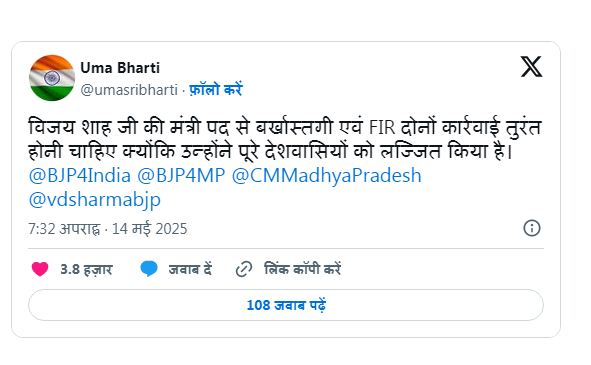उमा भारती ने सोशल मीडिया साइड एक्स पर पोस्ट कर विजय शाह के विवादित बयान पर अपना रूख साफ कर दिया है। अपनी पोस्ट में उमा भारती ने लिखा है- विजय शाह की मंत्री पद से बर्खास्तगी एवं FIR दोनों कार्रवाई तुरंत होनी चाहिए क्योंकि उन्होंने पूरे देशवासियों को लज्जित किया है। बता दें कि मंत्री विजय शाह को विवादित बयान देने के कुछ देर बाद ही पार्टी संगठन ने भोपाल तलब किया था और फिर पार्टी अध्यक्ष जेपी नड्डा ने भी रिपोर्ट मांगी है।