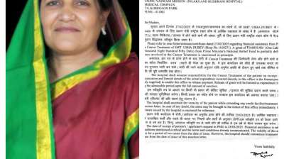 राज्यसभा सांसद की अनुशंसा पर कैंसर पीड़ित को मिली सहायता राशि